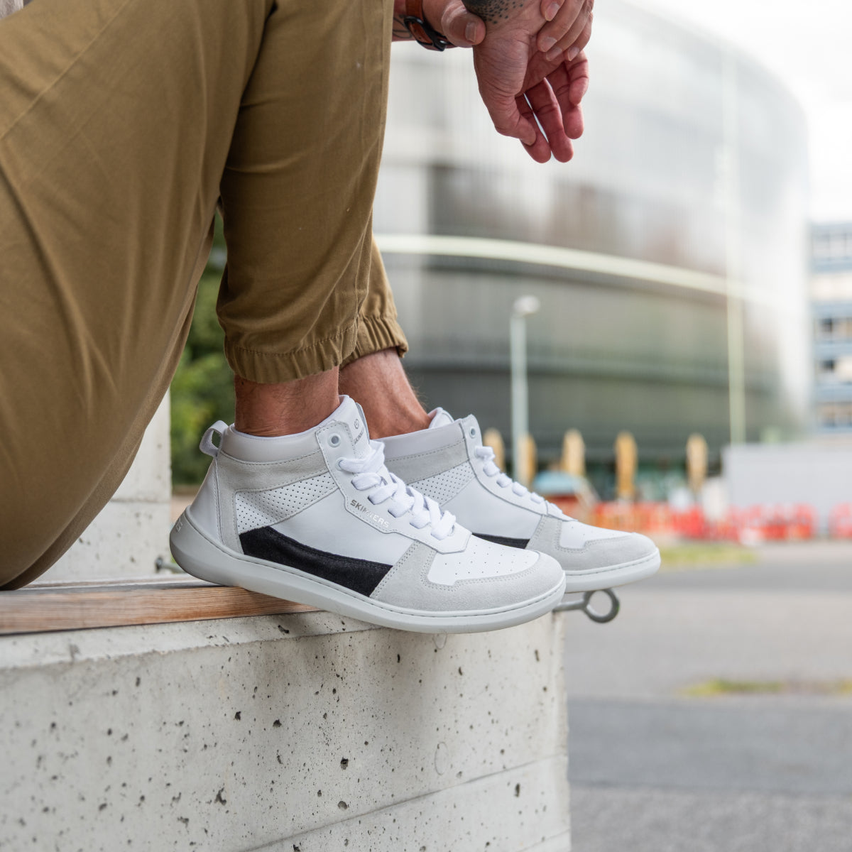 I love barefoot sneakers, and especially the Skinners. The materials used are super high quality and the craftsmanship is top-notch. Unique is the TENCEL™ lining, a fabric made from wood pulp. Soft, strong, and eco-friendly. The upper material, Italian leather, is pleasantly soft and robust. The sole of this barefoot shoes is stitched around the edge and visually extends far up the back to support the look. However, the shoe has zero drop, and I stand only 7 mm above the ground. For additional cushioning, there is a 3 mm thick insole included, which I find unnecessary here.