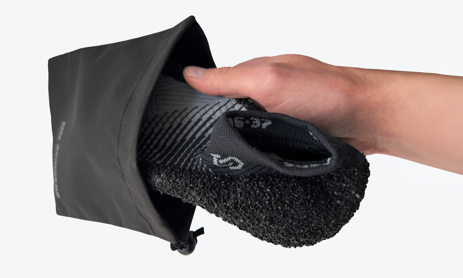 Verstauen Sie Ihre Sockenschuhe in einem kleinen, praktischen Beutel, der für den einfachen Transport konzipiert ist. Er ist leicht, klein und kann auch am Rucksack befestigt werden. So sind Ihre Skinners immer griffbereit, egal wohin Sie unterwegs sind.